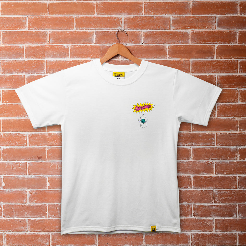 Bright, quirky, chaotic in the best way. The small front graphic keeps it subtle from the front, while the back turns into a full sticker-sheet of characters, shapes, and weird little surprises that make the tee feel alive.